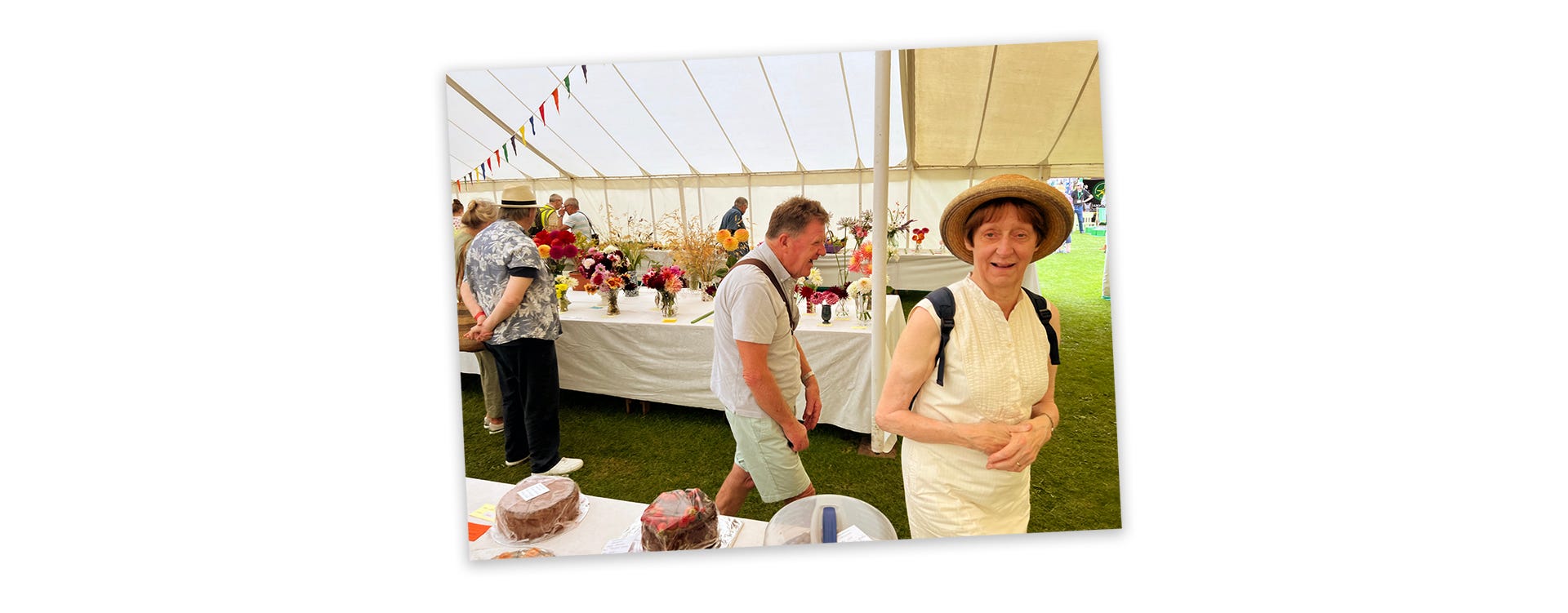 Inside the air changes. It’s a little cooler and scented with cut stems and earthy notes. Tables stretch the length of the tent. Crisp white cloths covered with vases, jars and bowls hold the floral contestants. Veg do battle for the longest runner bean and the straightest cucumber. Outside, the muffled sound of the band weaves among chatter of happy people, but inside there is a quiet reverence, a soft hush, as though everyone is visiting a cathedral made of petals and stems, built by nature and the devotion of gardeners.